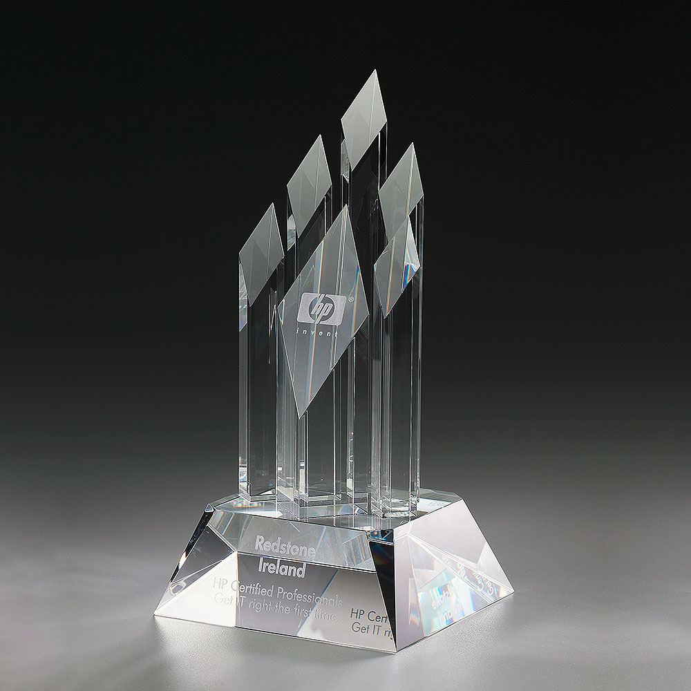 Absolute Spitzenklasse – diese Trophäe gehört zum Besten, was derzeit international angeboten wird. 5 rautenförmige Säulen bilden das Spalier für eine massive Mittelsäule. Mit 300 mm Höhe ein Blickfang! Für alle, die etwas Besonderes suchen. Gravur auf Mittelsäule und auf Sockel möglich.