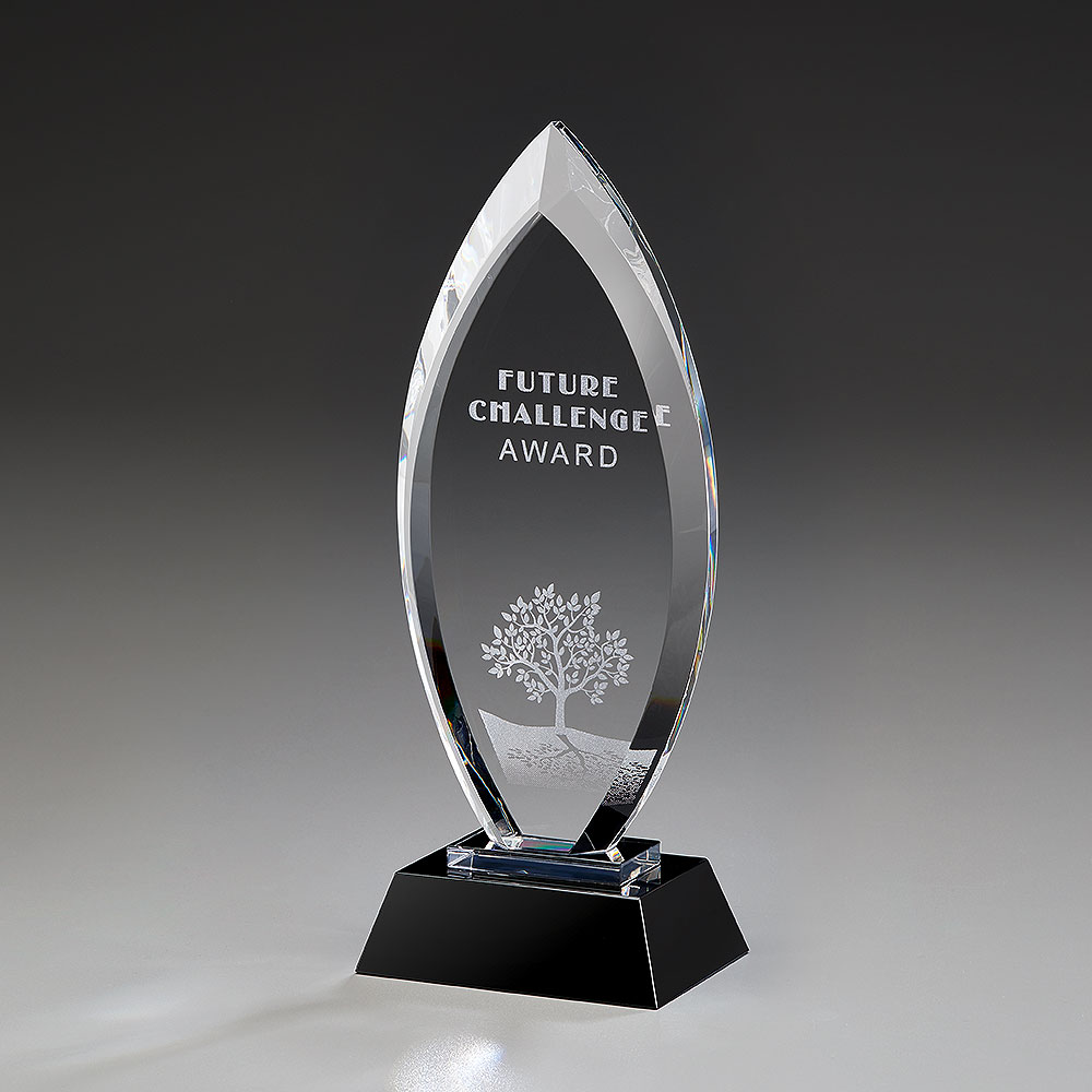 Majestätisch aufgerichtet, auf einem edlen schwarzen Sockel platziert: Diese Trophäe bezaubert durch den Lichteinfall auf den unterschiedlich zueinander stehenden Flächen. Ein königlicher Award!