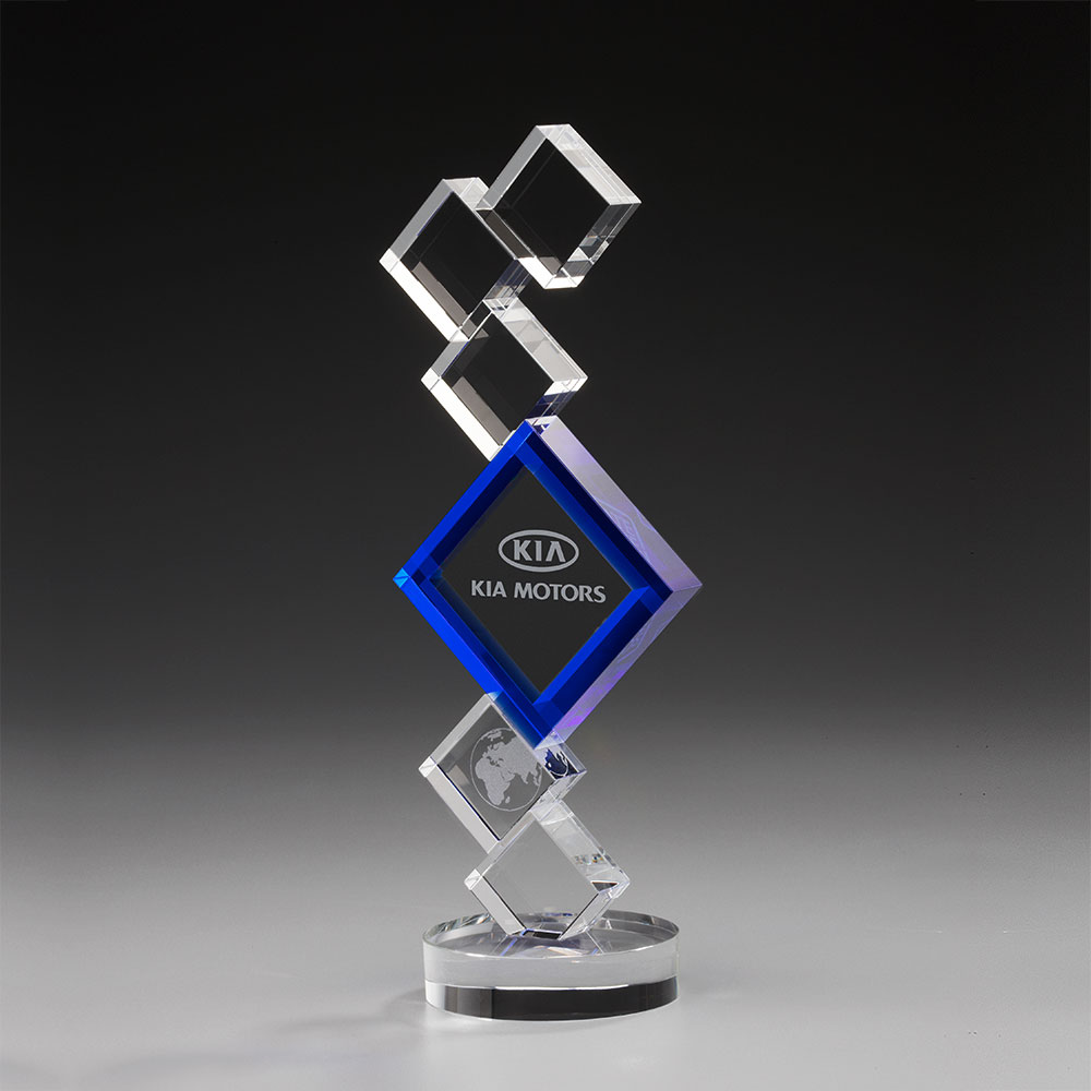 Wabenförmig bauen sich Kristallblöcke in die Höhe, in der Mitte ein mit blauem Kristallglas eingefasster Block als optischer Blickfang. 300 mm hoch!